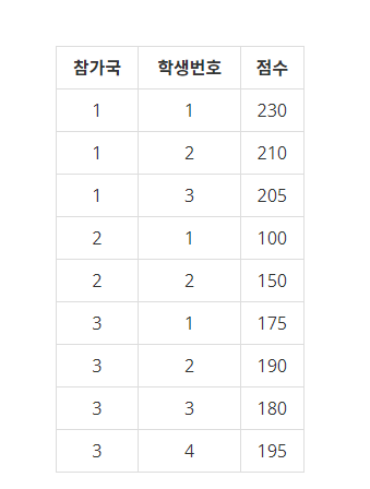 예를 들어, 대회 결과가 다음의 표와 같이 주어졌다고 하자.