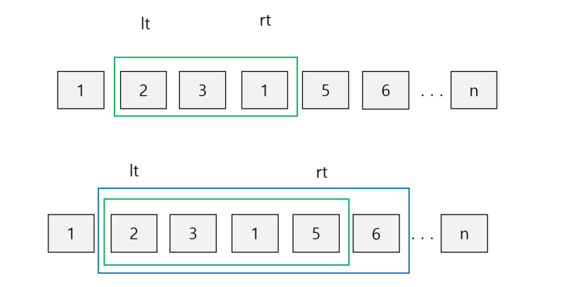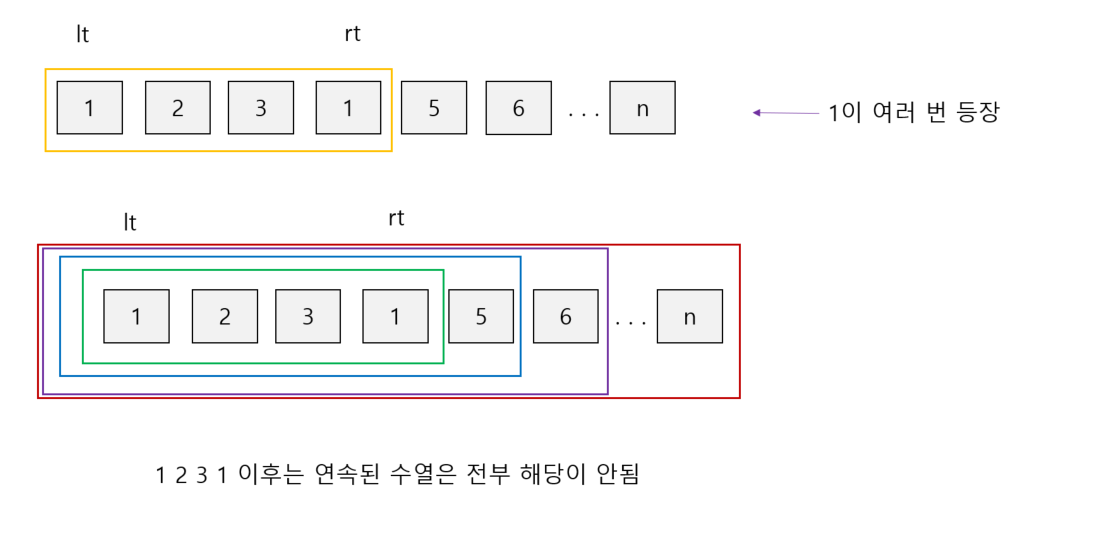 여러 번 들어있지 않으면 오른쪽 (rt) 포인터를 이동시킨다.
